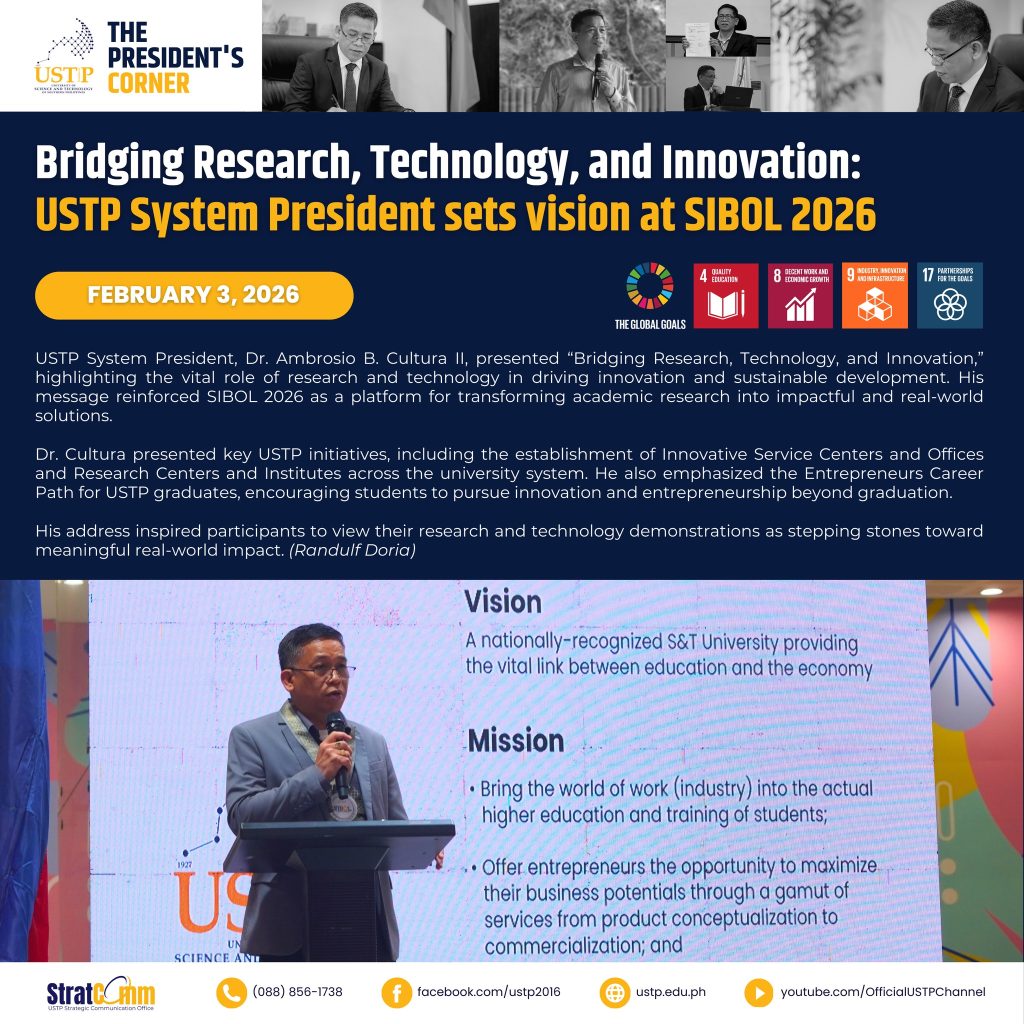 The USTP Claveria is another major campus under the USTP System strategically located at the heart of Eastern Misamis Oriental in the idyllic town of Claveria, Misamis Oriental. A campus invigorated with a natural fresh air, clean, cool, and friendly environment, it has a total land area of 104 hectares and is home to the AGROPOLIS Science and Technology Park.