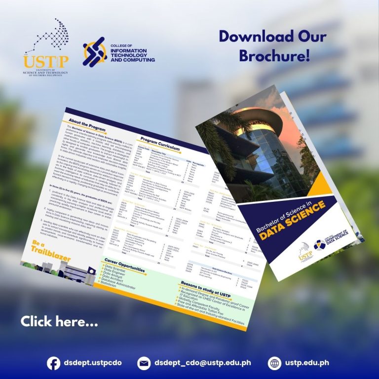Embark on your journey to become a data science pioneer with USTP’s Bachelor of Science in Data Science (BSDS) program! This cutting-edge interdisciplinary program equips you with a powerful blend of mathematics, statistics, machine learning, and database expertise, transforming you into a skilled data detective who can uncover game-changing insights from complex information. In an era where data drives innovation, our program is your launchpad into the high-demand world of data-driven decision-making. Whether you’re decoding patterns, crafting predictive models, or turning raw data into strategic gold, you’ll develop the expertise that today’s industries desperately seek. Join us in shaping the future of business intelligence and digital transformation – your path to becoming a data science rockstar starts here! 🚀📊