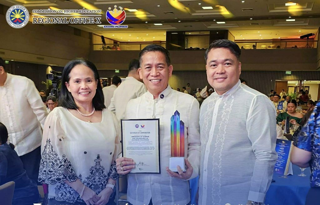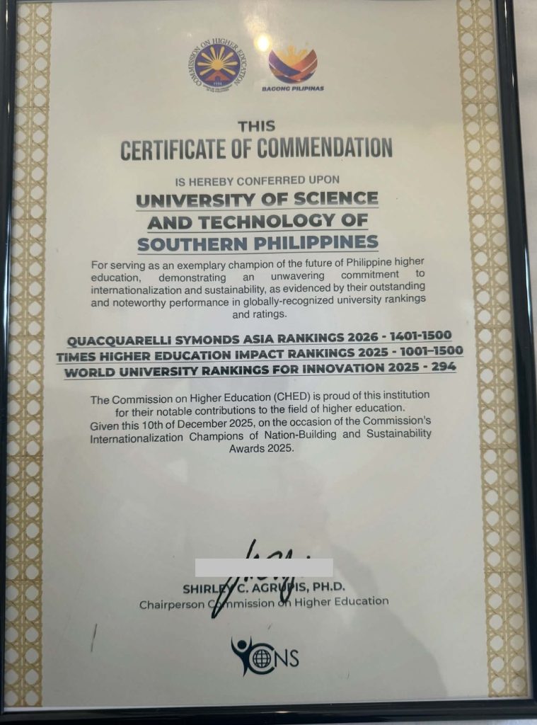 The University of Science and Technology of Southern Philippines (USTP) received a Certificate of Commendation from the Commission on Higher Education (CHED) during the Internationalization Champions of Nation-Building and Sustainability (ICONS) Awards 2025, held on December 10, 2025 at the Philippine International Convention Center (PICC), Pasay City. USTP System President Dr. Ambrosio B. Cultura II received the award.