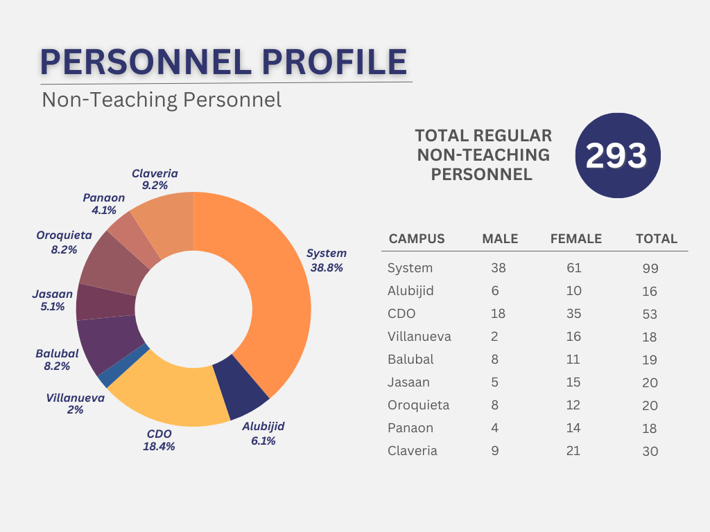 As of March 9, 2025, USTP employs 293 regular non-teaching staff: 98 males and 195 females, reflecting greater female representation.
