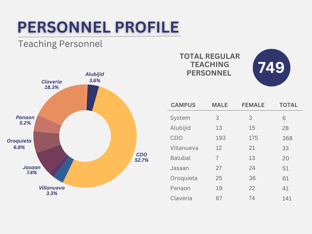 As of March 9, 2025, USTP employs 749 regular teaching staff: 366 males and 383 females, indicating an almost equal gender split across campuses.