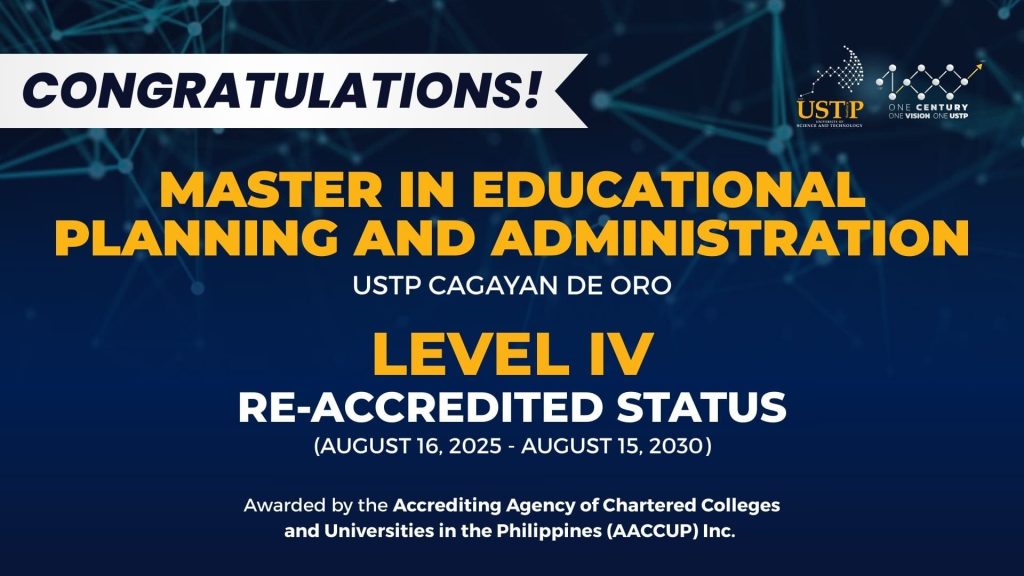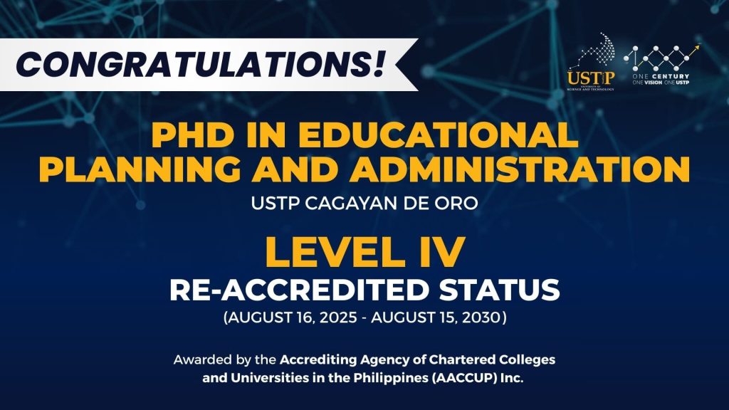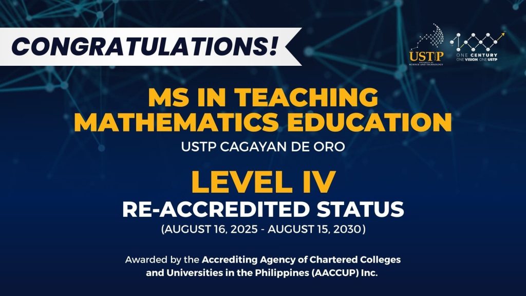 The University of Science and Technology of Southern Philippines in Cagayan de Oro (USTP CDO) proudly announces that three of its graduate programs the Master in Educational Planning and Administration, PhD in Educational Planning and Administration, and MS in Teaching Mathematics Education from the College of Science Technology and Education (CSTE) have officially obtained Level IV Re-accreditation from the Accrediting Agency of Chartered Colleges and Universities in the Philippines (AACCUP), Inc. These programs excelled across all evaluation areas, demonstrating competence in research, graduate performance, community service, international linkages, and the planning process.