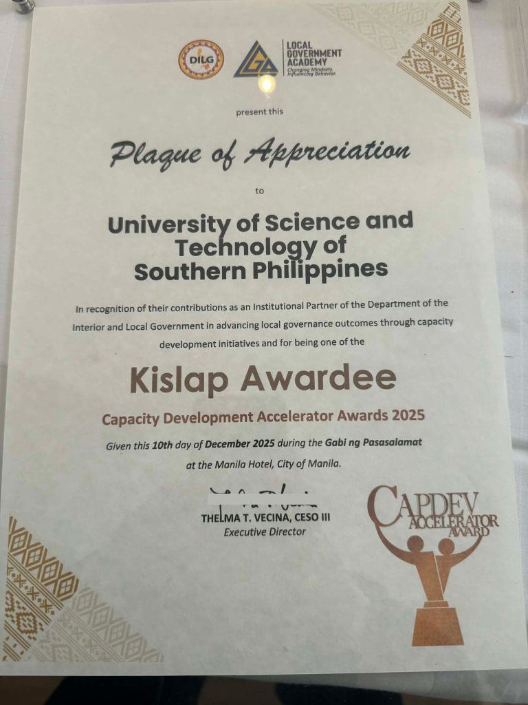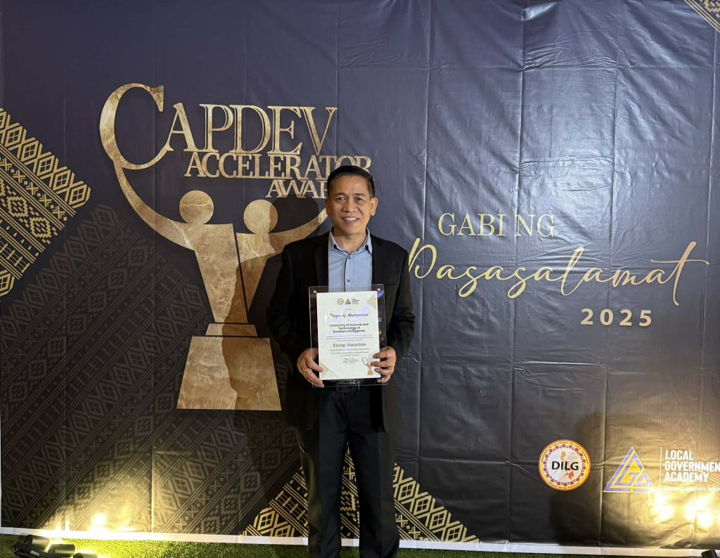 The University of Science and Technology of Southern Philippines (USTP) earned another national recognition after receiving the Kislap Award at the Capacity Development Awards for Catalysts of Excellence–Expanding Connections for Excellent Local Governance (CapDev ACE-ExCEL) on December 10, 2025, at The Manila Hotel, for its vital role in strengthening local governance through infrastructure audit capacity-building.