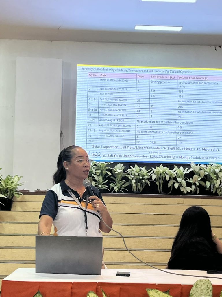 She presented yield data demonstrating the viability of the solar method using concrete beds, along with the cooking process implemented at the USTP Panaon campus. Dr. Anasco also discussed challenges encountered, including weather-related disruptions, and shared technical insights for producing high-quality salt—bridging academic research and practical application.